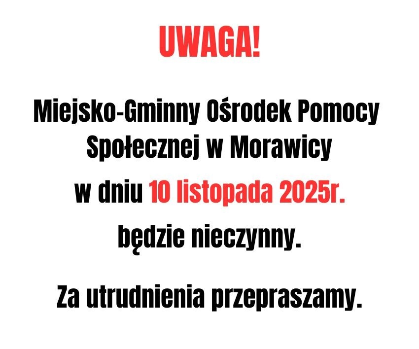 Czytaj Więcej o: Zarządzenie - dzień wolnyMiejsko-Gminny Ośrodek Pomocy Społecznej w Morawicy informuje, że w dniu 10 listopada 2025r. Ośrodek będzie nieczynny.